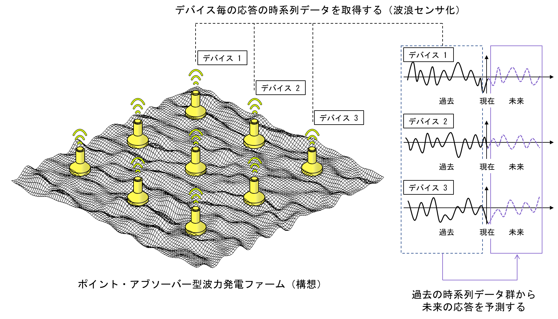 発電量を増やすためには、(1)複数のデバイスを用いてファーム化し、総発電量を増やす、(2)デバイスを制御することで発電効率を向上する、といった二つの方向性が考えられます。当研究室では(1)と(2)の両方の戦略を採用し、さらに当研究室独自に開発している波動場のリアルタイム予測を組み合わせています。その構想が次の図で、ポイント・アブソーバー型の波力発電デバイスを複数運用するファーム化することで総発電量を増やすとともに、それぞれのデバイスで計測した運動データから、他のデバイスに入射する数秒~数十秒後の波をリアルタイムに予測し、その予測データを用いてリアルタイムの最適制御を行います。