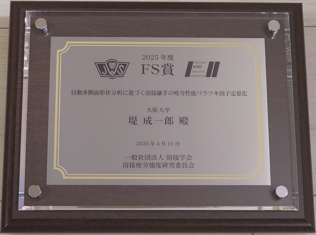 堤 成一郎 教授が溶接学会 溶接疲労強度研究委員会より「FS賞」を受賞しました.Professor Seiichiro Tsutsumi received the FS Award. 投稿日 2026年4月12日 更新日 2026年4月13日 著者 naoe2_admin1 カテゴリー 受賞 堤 成一郎,溶接学会 溶接疲労強度研究委員会「FS賞」(Fatigue Strength),”自動多断面形状分析に基づく溶接継手の疲労性能バラツキ因子定量化”,2026年4月10日 溶接疲労強度研究委員会 | Japan Welding Society HomePage(一般社団法人溶接学会)溶接疲労強度研究委員会 | Japan Welding Society HomePage(一般社団法人溶接学会)jweld.jp